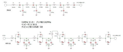 設計は両者とも 0.01dB リプルのチェビシェフ型です。インピーダンス50Ω、バンド幅は 0.938MHz (約 1 MHz) です。