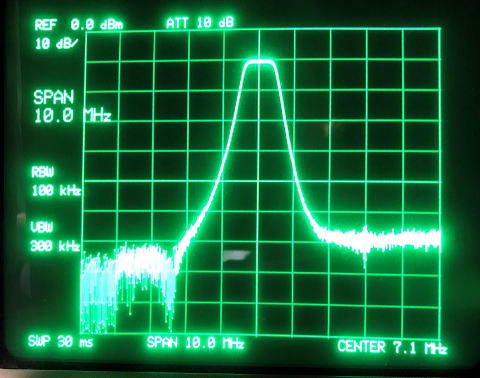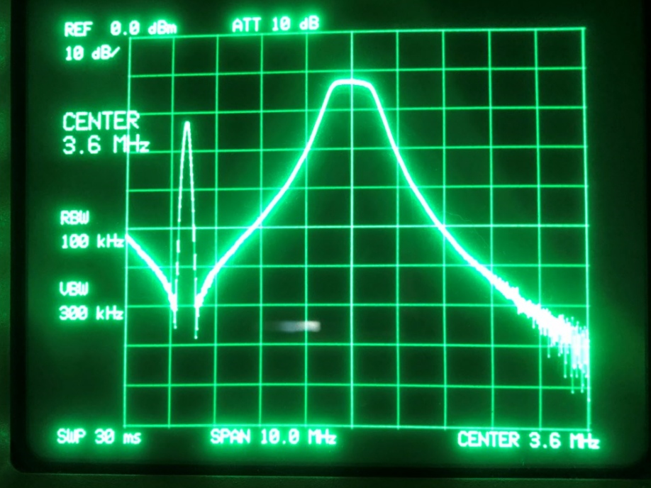 スペアナの横実一つが 1MHz ですからパスバンドはほぼ理論通り 1MHz になっています。左側の写真、左端にするどい山が出ているのは