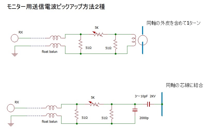 5KΩの可変抵抗器は受信機のSメーターが9+30dB程度の強度になるよう調節します。フロートバランは所謂コモンモードフィルター