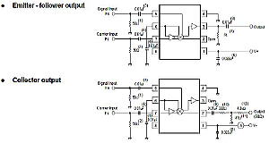 それぞれの画像をクリックすれば拡大されます。左はメーカーのテスト回路。エミッター出力方式とコレクター出力方式が表示されています。
