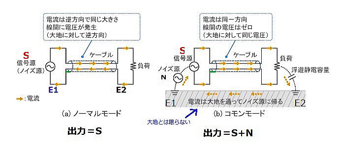 これに比べ右図の場合はE1とE2に電位の差が出来、これが原因でケーブルを通過する信号とは無関係に別のルートを経由して